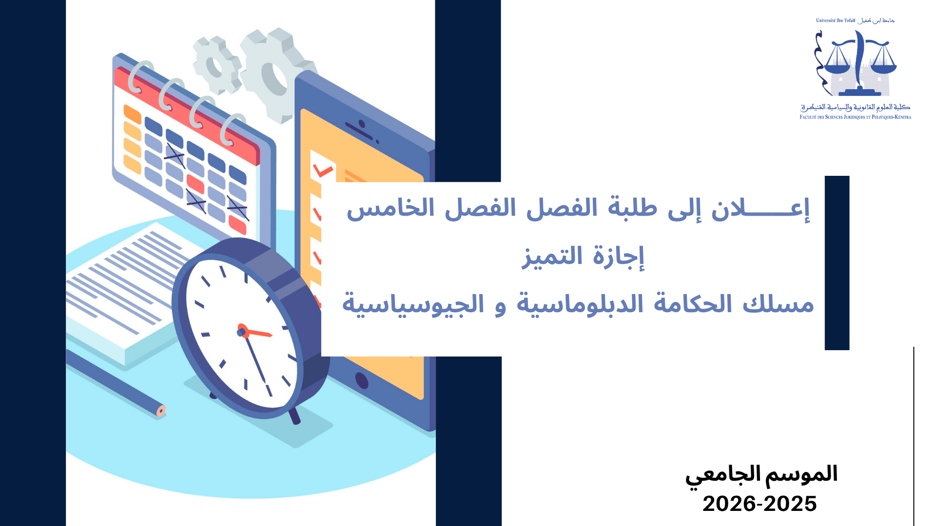 إعلان إلى طلبة الفصل الخامس- إجازة التميز- مسلك الحكامة الدبلوماسية و الجيوسياسية – الأستاذة أمال بنبراهيم