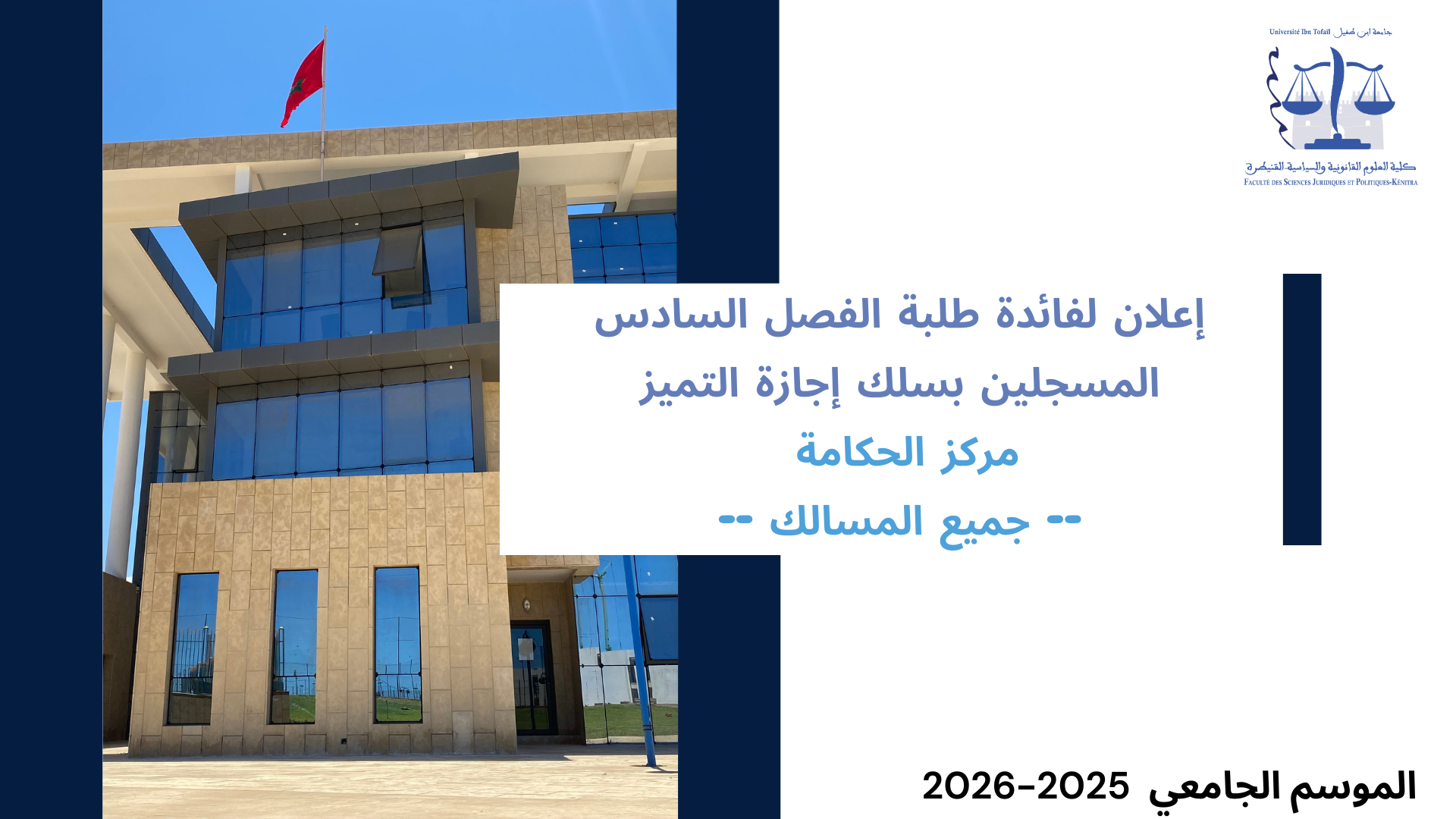 février 17, 202617 février 2026إعلان إلى طلبة الفصل السادس المسجلين بسلك إجازة التميز – مركز الحكامة – انطلاق محاضرات الدورة الربيعيةView Fullscreen