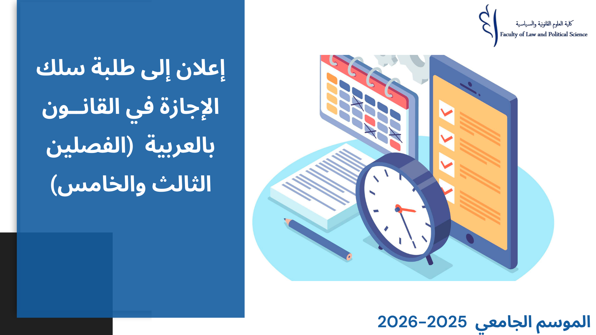 septembre 21, 202521 septembre 2025إعلان إلى طلبة سلك الإجازة في القانــون بالعربية والفرنسية (الفصلين الثالث والخامس) -انطلاق محاضرات الدورة الخريفية للموسم الجامعي 2026/2025View Fullscreen
