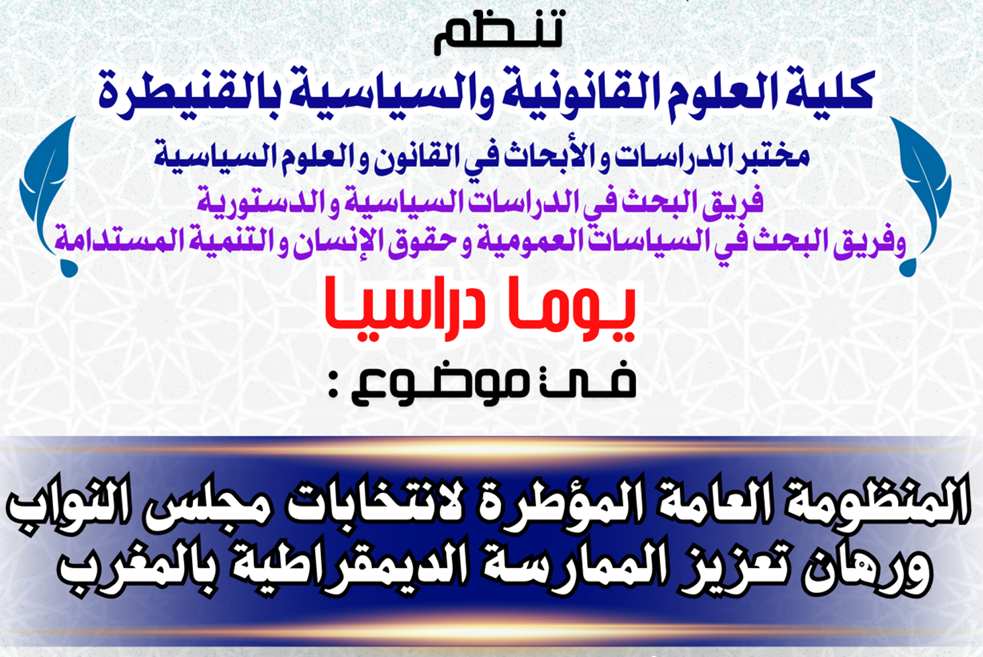 novembre 27, 202527 novembre 2025إعلان عن تنظيم يوم دراسيا في موضوع : المنظومة العامة المؤطرة لانتخابات مجلس النواب ورهان تعزيز الممارسة الديموقراطية بالمغربView Fullscreen