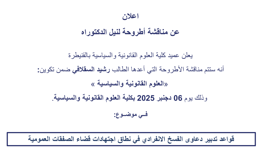 décembre 05, 20255 décembre 2025إعلان عن مناقشة أطروحة لنيل الدكتوراه في موضوع : قواعد تدبير دعاوى الفسخ الانفرادي في نطاق اجتهادات قضاء الصفقات العموميةView Fullscreen