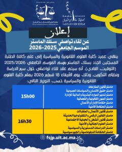 février 17, 202617 février 2026إعلان لطلبة الماستر الجدد المسجلين برسم الموسم الجامعي 2026/2025 – عقد لقاء تواصلي