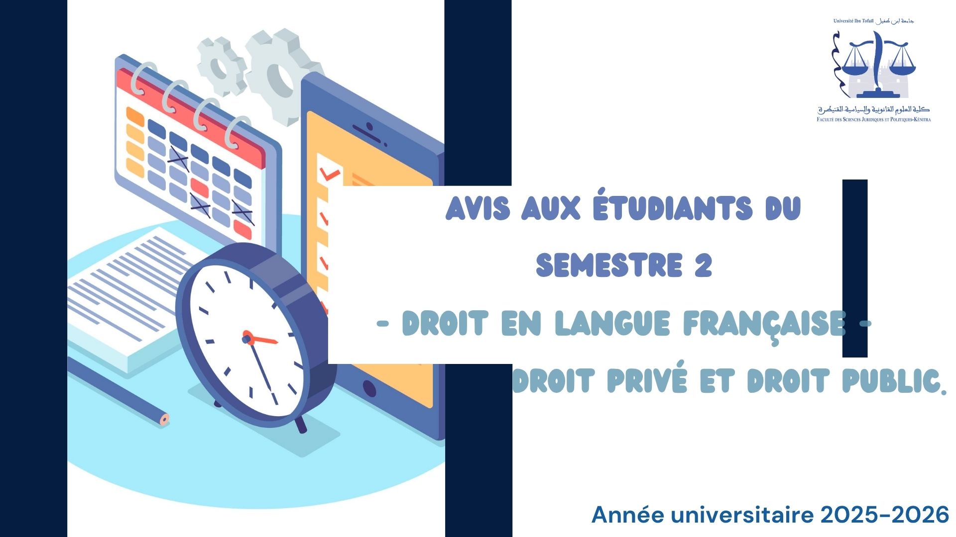Il est porté à la connaissance des étudiants du Semestre 2 Droit en langue française (Droit privé et Droit public) qu’une séance du cours « Introduction au droit administratif et organisation administrative » aura lieu Mercredi 29 avril 2026 à partir de 10H10 à la Salle 14 (centre de formation continue).